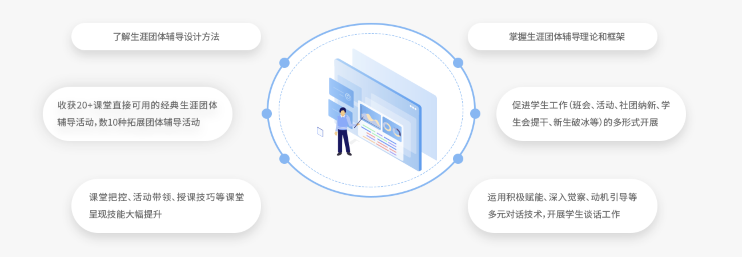 生涯团体辅导培训是由职业生涯领域众多资深讲师和生涯研发团队针对高校教师的需求而研发的精品培训。从酝酿到成型,共历时两年多。该培训通过教授高校生涯辅导教师团体辅导相关基础理论、实操技巧及团体辅导过程演练,结合大学生生涯发展过程中的实际问题,旨在提升生涯辅导教师的团体辅导授课能力、丰富学校生涯教育活动形式。