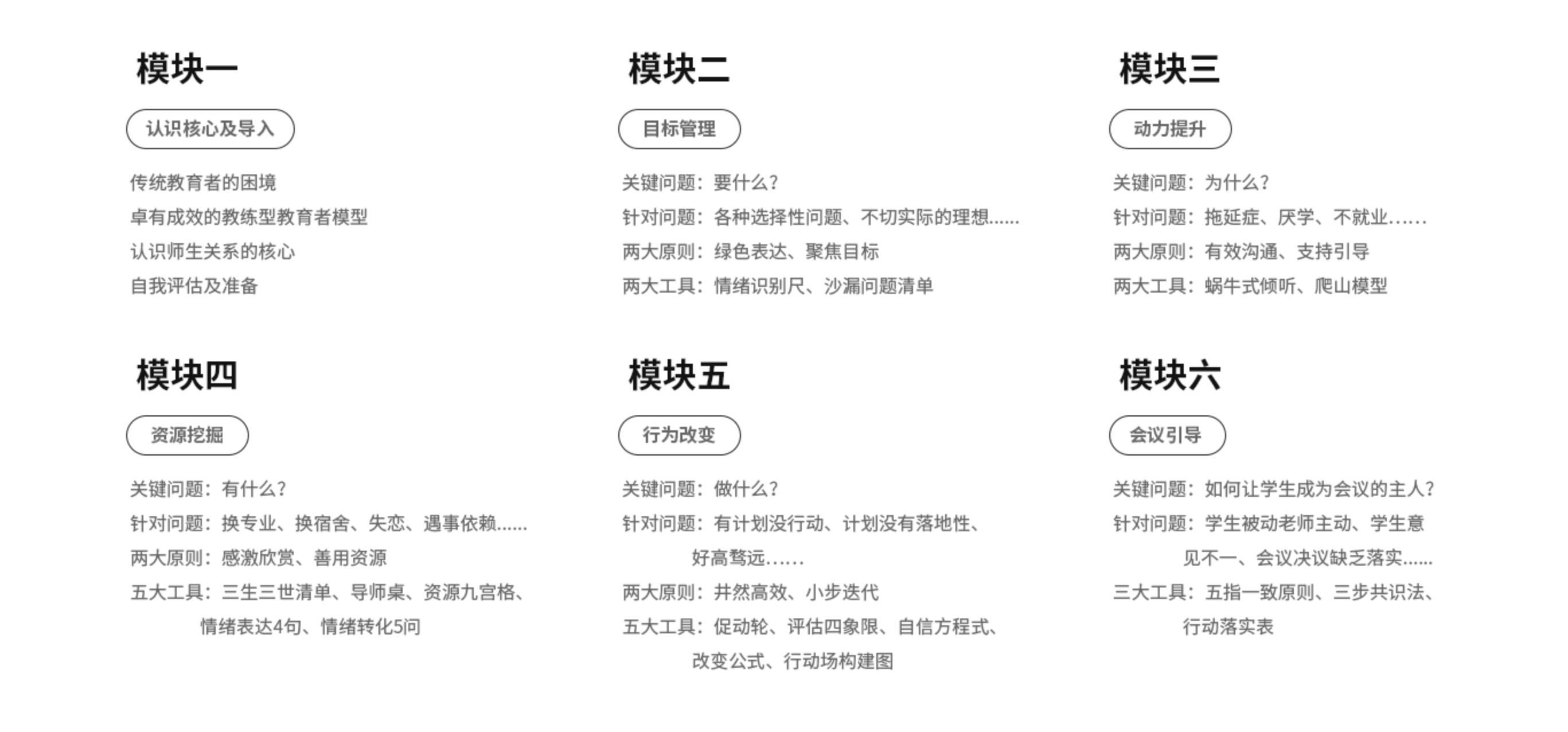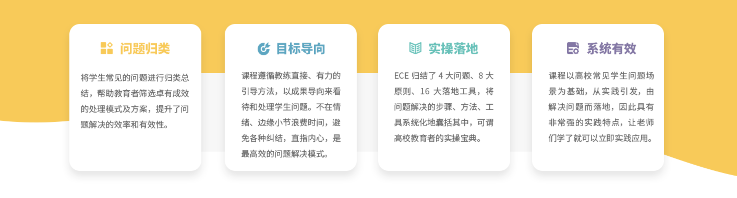 Effective coaching educator (ECE),卓有成效的教练型教育者是北森生涯讲师团队针对高校教师实际工作场景及工作挑战所设计的专业性问题解决课程。该课程采用当下最前沿的教练理念和模式,汲取教练关注结果、启发动机、落实行动的特点,将高校教师常见学生工作问题给予归类总结,并针对性地提出有效的操作方法。这些方法不仅可以提高高校教师的问题解决效率和能力,更能转变高校教育者的思维模式,使教育者获得全面的成长。