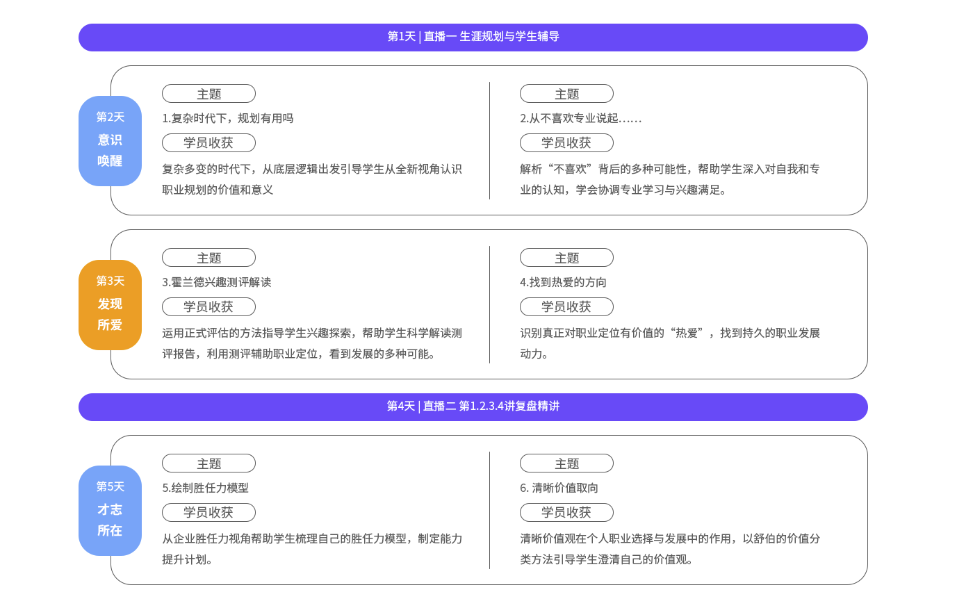 8大模块,16个问题场景,即可独立学习运用,亦有其内在的逻辑体系。以学生在大学时期间的真实生涯经历为主线,按照“唤醒生涯意识,促进规划动机→ 引领自我探索,清晰职业倾向→ 丰富职业体验,验证职业偏好→ 激励目标行动,提升能力资源→学习决策方法,直面未知世界”逻辑顺序,构建了大学生从规划到行动的完整体系。